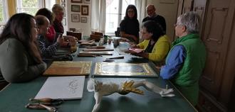 In der Reihe der Volkshochschule DonauZusam „Das Heimatmuseum holt sich Experten ins Haus“ verwandelte sich am Sonntag, 08.10.2023, das Stadtarchiv für eineinhalb Stunden in eine Kirchenmalerwerkstatt. Dabei ging es um die Blattvergoldung, genauer um Poliment- und Ölvergoldung. Nachdem die Teilnehmenden sich im Heimatmuseum verschiedene vergoldete Objekte angesehen hatten, konnten sie in der „Werkstatt“ ihre Kenntnisse über Werkzeuge und Techniken vertiefen und praktisch ausprobieren.