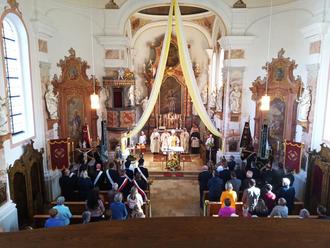 Viele Gläubige und auch Ehrengäste, darunter Laugnas Bürgermeister Johann Gebele, Gemeinderäte, Landtagsabgeordneter a.D. Georg Winter, Bezirksrat Johann Popp kamen nach Osterbuch und waren begeistert von dem schön renovierten Gotteshaus. Mit einem feierlichen Einzug allen voran die Musikkapelle Osterbuch, der Altardienst, die Fahnenabordnungen der Vereine und zuletzt Bischof Dr. Bertram Meier, Pater Tomasz,Pfarrer Alois Roßmanith und Diakon Jürgen Brummer zog man feierlich ins Gotteshaus ein. Der Zusamaltheimer Kirchenchor bereicherte mit der Mozartmesse das Pontifikalamt.