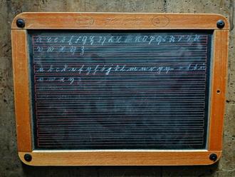 Die Schiefertafel der Marke Teutonia mit der Lineatur für die erste Klasse