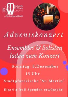Die Schülerinnen und Schüler der Musikschule freuen sich, passend zum Advent die Stadtpfarrkirche St. Martin als besonderen Konzertraum nutzen zu dürfen. Sie laden die Zuhörer am ersten Adventssonntag, am 3. Dezember um 15 Uhr ein, andächtige Musik zu genießen und die Adventszeit bewusst zu leben.