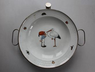 In der Mitte des tiefen Tellers ist ein Bub zu sehen mit weißer Hose, blauem Oberteil und roter Mütze. Rechts neben ihm ein Storch. Beide sehen sich an. Der Junge blickt dabei ehrfürchtig auf zum Storch.