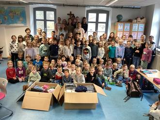 „Meins wird Deins“, so heißt die Aktion von Kindermissionswerk/Die Sternsinger und der aktion hoffnung im Bistum Augsburg. Rund um den Martinstag sind Kinder, Jugendliche und Erwachsene in Kitas, Schulen und Pfarrgemeinden und gerne auch Privatpersonen eingeladen, Kleidung nach dem Vorbild des Heiligen Martin zu teilen. Dieses wird dann von der aktion hoffnung verwertet und der Erlös für ein Projekt in der Einen Welt zur Verfügung gestellt. In diesem Jahr wird ein Schulprojekt für Kinder und Jugendliche in Bangladesch unterstützt. Kindergartenleiterin Angelika Stegmair stellte den Kindern der Grundschule und des Kindergartens in Binswangen die Aktion vor. Gemeinsam gestalteten sie die Übergabe mit Liedern, passend zum Martinsfest. Zwei große Kisten konnten so gepackt werden, die ihren Weg über Augsburg zur Zentrale des gemeinnützigen Unternehmens nach Ettringen finden.