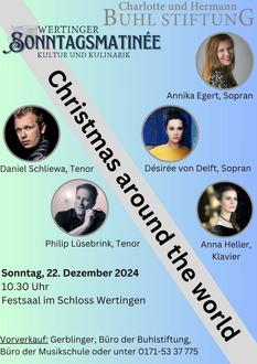 Am Sonntag, den 22. Dezember 2024, lädt die Charlotte und Hermann Buhl Stiftung bei ihrer nächsten Sonntagsmatinée zu einem musikalischen Start in den vierten Advent ein. Ab 10:30 Uhr führt ein festliches Programm im Festsaal des Wertinger Schlosses auf eine Reise mit weihnachtlichen Klänge und Traditionen aus verschiedenen Ländern der Erde.