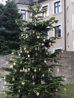 Die Freien Wähler Wertingens haben heuer wieder ihren Nachhaltigkeitsbaum mit geschnitzten Christbaumschmuck gestiftet von Josef Brunner geschmückt.