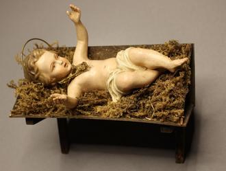 Das Objekt des Monats Dezember ist eine kleine Holzkrippe, die 14 cm breit, 24 cm lang und 29 cm hoch. In ihr liegt mit ausgebreiteten, dem Betrachter zugewandten Armen das Jesuskind. Es trägt eine weiße Windel und ist aus Gips gefertigt. Kopf und ein Fuß mussten neu angeklebt werden, dabei erhielt der Hals ein goldfarbenes Geschenkband um den Hals, um die Bruchstelle zu kaschieren. Ein Heiligenschein aus Draht ist in Goldbronze bemalt und umgibt den Kopf des Kindes.