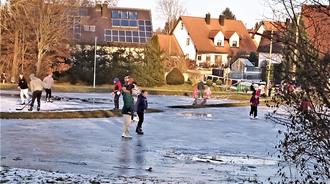 Nachdem dem kürzlichen Schneefall der keine Bedingungen zum Schlitten fahren zeigte, wurde durch die eiskalten Nächte der Eislaufplatz auf der Wiese bei Gottmannshofen zum Schlittschuhlaufen und Eishockey hergenommen. Wie lange das Eis noch hält, hängt von den immer wärmeren Temperaturen ab.