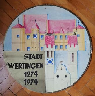Das Objekt des Monats Februar würde den Rahmen der Vitrine sprengen, denn es besitzt einen Durchmesser von 0,65 Metern. Deshalb ist stellvertretend ein Foto ausgestellt. Die Grafik wird normalerweise im Depot des Heimatmuseums aufbewahrt. Bei ihr handelt es sich um einen Farbentwurf zur 700-Jahrfeier der Stadt Wertingen (1974). Stadtpfarrkirche und Schloss sind dargestellt. Gestaltet hat ihn der Kunstmaler und Grafiker Walter Hopp (1922–1985). Eine kleinere Version davon ist in der Festschrift zur 700-Jahr-Feier der Stadt 1974 abgedruckt.