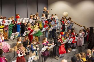 Das Faschingsfieber hat die Musikschule gepackt. 130 Musikschülerinnen und Musikschüler luden zum närrischen Treiben ins Forum des Gymnasiums. Zur Eröffnung heizte das „Fliegerlied“ ein. Egal, ob Groß oder Klein, Jung und Alt, Meerjungfrau, Harry Potter oder Prinzessin, alle flogen, hüpften, klatschten und sangen mit.