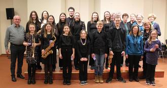 Die Mitwirkenden beim Neujahrskonzert der Musikschule Wertingen stellten sich unter dem Applaus des Publikums dem Fotografen.