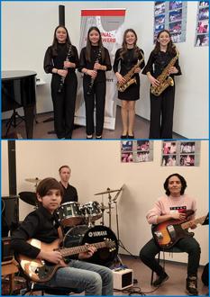 Erfolgreiche junge Musikerinnen aus der Musikschule Wertingen: (oben v. l.) Die Duos Sophia Tschan & Isabell Tschan sowie Celina Bunk & Johanna Pfeiffer aus der Klarinetten- und Saxofonklasse von Manfred-Andreas Lipp freuen sich jeweils über einen 1. Preis mit Weiterleitung. Timo Horn (unten links) erspielte sich auf der E-Gitarre bei Jugend musiziert mit 23 Punkten einen 1. Preis mit Weiterleitung, Begleitet wurde er von seiner Lehrerin Adriana Gomez (unten rechts) mit dem E-Bass und Kacper Bunkowski (unten mitte) am Schlagzeug.