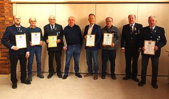 Die Geehrten im Bild von links nach rechts. Kassenwart Schrödl Ernst, Ehleiter Hubert,Schrödl Engelbert,Hafner Alfred, Willy Lehmeier, Georg Humbauer,1. Kreisvorsitzender Endres, 2. Vorstand Alfred Schrödl