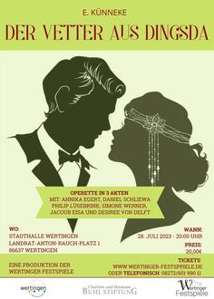 Im Rahmen der „Wertinger Festspiele“ der Charlotte und Hermann Buhl Stiftung wird „Der Vetter aus Dingsda“, eine Operette in drei Akten des deutschen Komponisten Eduard Künneke (1885-1953) aufgeführt. Die Veranstaltung findet am Freitag, 28. Juli um 20 Uhr in der Stadthalle Wertingen statt.