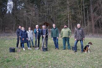 Am Standort der neuen Streuobstwiese trafen sich die Vorstandsmitglieder des Gartenbauvereins Altenmünster mit Fachberater und Unterstützern. Auf dem Bild von links: Carina Wittmann, Juliane Horn, Diane Glück, Vorstand Siegfried Kränzle, stellvertr. Vorstand Björn Hunzinger, Thomas Holzheuer (Raiffeisenbank), Benedikt Weidner (Landratsamt) und Dieter Erhard (Bayer. Staatsforsten)