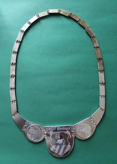 Wie kam die Kette ins Heimatmuseum Wertingen? Sie wurde 1998 von Goldschmied und Uhrmachermeister Simon Hirn aus Wertingen in 925er Silber (= Sterling-Silber) in Handarbeit angefertigt, poliert und graviert. Ein edler Spender aus Gottmannshofen gab sie in Auftrag und überreichte sie dem damaligen Bürgermeister Dietrich Riesebeck. Riesebeck, 1972–2002 Bürgermeister von Wertingen, zeigte sich stolz mit ihr nach der Übergabe auf einem Pressefoto in der Wertinger Zeitung. Es ist allerdings das erste und letzte Mal, dass die Kette getragen wurde. Sie kam schließlich ins Wertinger Heimatmuseum und wird dort im Depot aufbewahrt. Momentan ist sie als Objekt des Monats März in der dafür vorgesehenen Vitrine im Schlosseingang zu besichtigen.