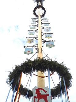 STATTLICHE Maibäume werden wieder zum 1.Mai nach zweijähriger Coronapause in Stadt und Land erstellt. Teils mit Maschinen und auch Manneskraft werden die Maibäume in die Höhe gehievt.