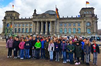 Sehr früh wurde am folgenden Tag das interessante Programm fortgesetzt. Die Sicherheitskontrolle vor dem Eintritt in den Deutschen Bundestag stand bereit und so wurde zügig auf der Besuchertribüne im Plenarsaal Platz genommen. Den interessanten Ausführungen der Gastgeber folgten Fragen und Erinnerungsfotos. Nach einem Informationsgespräch mit Heike Tomesch, einer Mitarbeiterin von MdB Ulrich Lange, ging es auf die Glaskuppel des Reichstags. Dem obligatorischen Rundgang und vielen Fotos folgte ein Mittagessen im Besucherrestaurant des „Paul-Löbe-Haus“. Die geplante Stadtführung mit unserem Reiseführer Michael Rautenberg begann direkt danach. Mit dem Bus ging es weiter zu den wichtigsten Sehenswürdigkeiten der Hauptstadt. Der Höhepunkt war sicherlich der Besuch im neuen Schloss an der Straße „Unter den Linden“ am Berliner Dom und der Bummel über die Museumsinsel. Zum Schluss stand noch ein Besuch in der Bernauer Straße bei der Gedenkstätte für die Maueropfer an. Die Kinder stellten viele Fragen und Herr Rautenberg wusste auf alles eine Antwort. Ein Spieleabend in der Jugendherberge rundete den 3. Tag der Konzertreise ab.