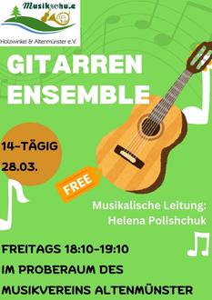 Komm zum nagelneu gegründeten Gitarrenensemble. Wir proben 14-tägig am Freitag von 18:10 bis 19:10 im Proberaum des Musikvereins Altenmünster (Rathaus Altenmünster). Helena Polishchuk hat für jeden eine passende Stimme dabei. Unsere nächste Probe findet am Freitag, 28.03. statt!