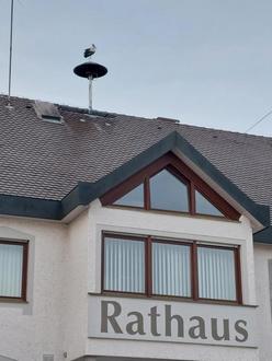 Einen besonderen Platz suchte sich dieser Storch während seines Ausfluges von seinem Hort in der Ortsmitte von Altenmünster aus. Auf der Sirene auf dem Rathausdach war er damit bestimmt der erste, der eine Alarmierung mitbekommen hätte. Oder wartete er hier, um im Rathaus die Geburt eines Neubürgers anzukündigen? Auf jeden Fall hatte er von dieser Postion aus den besten Überblick auf die am Rathausplatz stattfindende Maifeier.