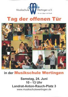 Am Samstag, den 24. Juni öffnet die Musikschule Wertingen von 10 bis 13 Uhr am Landrat-Anton-Rauch-Platz 3 in Wertingen ihre Türen für alle, die ein Musikinstrument erlernen oder einen Kurs der elementaren Musikerziehung buchen möchten. Es gibt die Möglichkeit alle Fachbereiche und die entsprechenden Lehrer kennenzulernen, Instrumente anzuschauen und anzuhören.