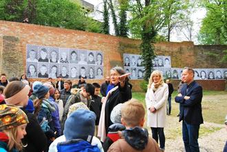 Ausstellungseröffnung im Schlossgraben zum weltweiten "inside out" Projekt 120 Kinder auf riesigen Portraits blicken von der altehrwürdigen Schlossmauer in die Zukunft. Die Ausstellung wurde am 25. April eröffnet und Wertingens Bürgermeister, Willy Lehmeier, lud zur Brotzeit ein. Auf Initiative der Montessori-Schule wurde vor einem Jahr dieses große Projekt gestartet, das nun Fotos von Schülerinnen und Schülern aller Schularten zeigt. Die Botschaft lautet: "Jeder Mensch ist gleich wichtig und wertvoll!" Von rechts: Bürgermeister Willy Lehmeier; Christiane Grandé, Rektorin der Grundschule Wertingen; Sonja Spiegler, Geschäftsführerin der Montessori-Schule sowie begleitende Lehrkräfte und Eltern von Mittelschule, Realschule und Gymnasium Wertingen und einige der portraitierten Kinder