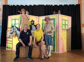 Von links: Pferd "Kleiner Onkel", Janina Maria Schmaus als Pippi mit Äffchen "Herr Nilsson, Stefan Litzel 1. Vorstand der FFW Hennhofen, Verena Konietschke als Pippis Vater (Seemann), Julia Rieblinger als Nachbarskind Annika und Fritz Weinert als Frau Prysselius Bild: Johann Rößle