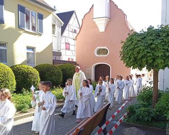 An einem sonnigen Maisonntag gingen 29 Kommunionkinder in der Pfarrei St. Martin erstmals an den Tisch des Herrn. Eine Woche zuvor fand die Kommunionfeier in Binswangen und Gottmannshofen statt. Unser Bild zeigt den feierlichen Einzug in die Kirche mit Stadtpfarrer Rupert Ostermayer.