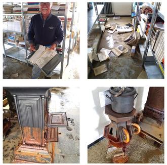 Im ehemaligen Gebäude von Telekom, wo sich das Ofenmuseum,das Firmenarchiv der Firma Denzel und Bücher vom Professor Dr. Peter Fassl, dem ehemaligen Bezirksheimatpfleger von Augsburg, befinden, hat das Zusamwasser ziemlich viel vernichtet. Das Wasser stand im Erdgeschoss 50 Zentimeter hoch, sodass auch das Firmenarchiv der Firma Denzel in große Mitleidenschaft gezogen wurde. An etlichen gusseinernen Öfen, die im Erdgeschoss standen, hat sich gleich Rost gebildet, der sich aber mit mühevoller Arbeit wieder entfernen lässt. Anton Stehle der das Ofenmuseum betreut, zeigte uns den Schaden.