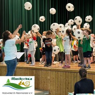 Passend zur Europameisterschaft dieses Jahr im eigenen Land, veranstaltete die Musikalische Früherziehung der Musikschule Holzwinkel und Altenmünster ein eigenes Konzert ganz unter dem Motto: „Fußball“! Unsere Jüngsten präsentierten in der Mehrzweckhalle Adelsried am Sonntag, 23.06. unter der Leitung von Katharina Riechert-Kuchler schwenkende Fahnen, Fußball-Lieder und Fußball-Luftballons als Percussion-Instrument. Am Klavier wurden sie von Sarah Kazemiyeh begleitet und eine rundum gelungene Geschichte wurde von Yvett Eckstein vorgetragen, um alles mit einem roten Faden miteinander zu verbinden.