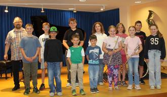 Zum Abschluss des tollen Konzertabends gab es unter dem Applaus des Publikums noch ein Erinnerungsfoto mit den jungen Künstlern und Musiklehrer Manuel Schnell (links).
