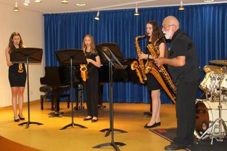 Das Saxofonquartett mit v. l.: Chiara Bunk (Sopransaxofon), Sarah Wiedmann (Altsaxofon), Lucia Reiter (Tenorsaxofon) und Manfred-Andreas Lipp (Baritonsaxofon) gestalteten das Finale des Konzertes.