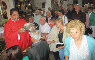 Kaplan Pater Jiby John feierte in der Pfarr und Wallfahrtskirche St. Michael in Violau den Wallfahrtgottesdienst zu Ehren der Enthauptung des heiligen Täufers Johannes. Das Johannes Haupt ist das zweite Wallfahrtsbild neben der Gottesmutter Maria in Violau. Das Haupt wird nach dem Gottesdienst auf Wunsch den Kirchenbesucher aufgelegt, das bei allen Kopf Leiden helfen soll, wenn man nur daran glaubt.