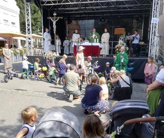 Zum festlichen Gottesdienst eingeladen waren auch die Kinder mit ihren Fahrzeugen. Zahlreiche Roller und Fahrräder waren so vor der Bühne versammelt. Mit einem besonderen Segensgebet bedachte sie am Ende des Gottesdienstes Pfarrer Michale in bunter Runde, wobei er auch gleich alle anderen Gefährte wie Kinderwägen und Rollatoren mit einbezog. Als Erinnerung erhielt jedes Fahrzeug dann einen Aufkleber mit einem Segensspruch für die Teilnahme im Straßenverkehr.