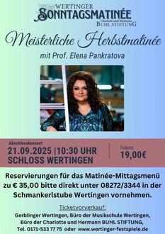 Als besonderes Highlight lädt die Charlotte und Hermann BUHL STIFTUNG am 21. September um 10.30 Uhr zur feierlichen Sonntagsmatinée in den Festsaal des Wertinger Schlosses ein. Die Teilnehmer präsentieren die erarbeiteten Werke und bieten ein eindrucksvolles Konzert voller musikalischer Höhepunkte.