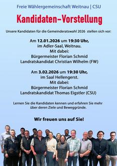 An beiden Terminen stellen sich außerdem die Kandidatinnen und Kandidaten der Liste „Freie Wählerschaft Weitnau / CSU Weitnau“.