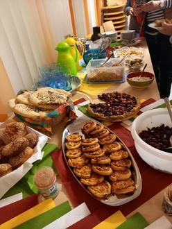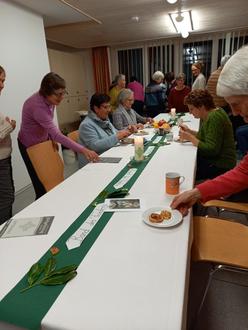 Wir haben den Gottesdienst mit den Texten und Liedern aus Palästina solidarisch mit den Frauen dieses Landes gefeiert. „Unsere WGT-Band“ hat uns wieder hervorragend musikalisch unterstützt. Die Texte, auch die der Lieder, sind richtig intensiv und aufrichtig gläubig ausgesucht und verfasst. Alle Frauen im Saal sind mit Andacht und Freude am Gebet für die Betroffenen aus Palästina bereit, sie zu unterstützen und zu begleiten. „Gott erhebe sein Angesicht auf uns und gebe uns Frieden“, diesen Segen vor dem Schlusslied: Der Tag ist um, die Nacht kehrt wieder..trifft den Wunsch aller anwesenden Frauen. Nach dem Gottesdienst gab es wieder gute Gespräche und landestypische Speisen. Allen, die zum Gelingen des WGT beigetragen haben, danken wir an dieser Stelle ganz herzlich. Es war ein sehr schöner, stimmiger und intensiver Abend.