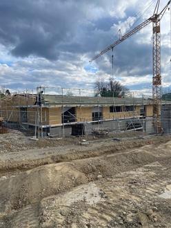 Bei der Baustelle der Kinderkrippe steht das Zimmerer-Team inzwischen kurz vor der Fertigstellung. Im Anschluss wird der Spengler seine Arbeit aufnehmen und das Dach final fertigen.