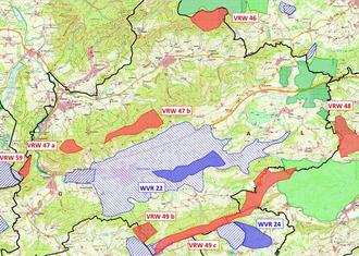 Rot schraffiert die geplanten Standorte der Windkraftanlagen: der Weitnauer Gemeinderat sagt "Nein!" dazu.