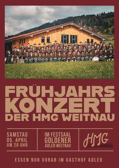 Die HMG Weitnau lädt Sie recht herzlich zum diesjährigen Frühjahrskonzert am 05. April in den Adlersaal in Weitnau ein. Es erwartet Sie ein abwechslungsreiches Programm, das von Marsch über Polka bis hin zu modernen Werken und klassischen Stücken alles beinhaltet.