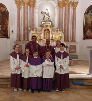Die Ministranten Sophia und Theresa Eugler, Jan, Franek und Kacper Misiek zusammen mit Pfarrer Sanoj Mundaklappel, Bischof Peter Kochupurackal und Mesnerin Gabi Zeh