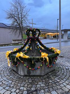 Jedes Jahr in der Karwoche werden im Allgäu die Dorfbrunnen geschmückt. Ursprünglich als Brauchtum zur Ehre des Wassers als lebensspendendes Element in Franken gepflegt, bringen schon seit vielen Jahren auch bei uns die liebevoll dekorierten Brunnen mit bunten Eiern und frischem Grün nach dem Winter den ersten Farbtupfer ins Dorf. Geschmückt wird der Buchenberger Brunnen nicht nur mit bunten Eiern, Weißdaas und farbenfrohen Bändern, sondern auch mit immergrünem Buchs, der als Symbol des ewigen Lebens gilt. Für uns Buchenberger ist der geschmückte Osterbrunnen jedes Jahr eine ganz besondere Freude und macht den Rathausplatz im Frühling zu einem einladenden Treffpunkt für das ganze Dorf.