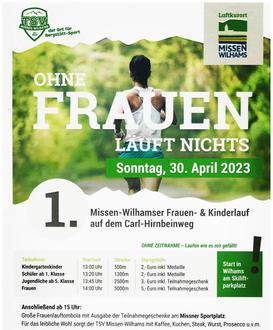 Dieses Motto steht für eine neue Laufveranstaltung am Sonntag, den 30. April 2023 in Missen-Wilhams, bei der die Frauen im Mittelpunkt stehen. Dabei müssen die Frauen keine Angst haben, sich mit Laufprofis messen zu müssen. Der Lauf hat keinen Wettbewerbscharakter und die 5 km lange Strecke ist auch für Ungeübte geeignet. Im Vordergrund steht die Freude an der Bewegung. Joggen, Walken, Laufen - jede Teilnehmerin entscheidet selbst, wie sie die Strecke zurücklegen möchte, gerne auch gemütlich mit Walking-Stöcken.