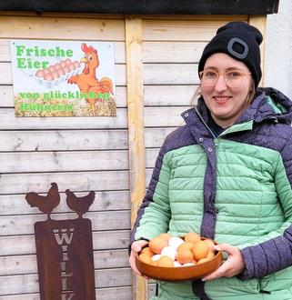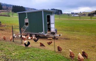 „Ich glaube, dass meine Hühner glückliche Hühner sind,“ sagt Andrea Ücker. „Sie können picken, beobachten, in der Sonne baden und umherrennen. Was will man mehr als Huhn. Und das schmeckt man auch,“ lacht sie wieder. Rührei, Spaghetti Carbonara, Omelette oder gekocht zum Frühstück – die Ückers essen ihre in Freilandhaltung produzierten Eier auch selbst sehr gern. Auf ihrem Hof halten sie zwei Rassen, einmal die aus Holland stammenden „Bovan-Hühner“, zum anderen die in Italien beheimateten „Leghorns“. Als Andrea mit den Eiern anfing, wackelte noch eine besonders fluglustige Rasse über die Weitnauer Wiesen, doch die hat sie bald wieder verkauft: „Die saßen gern auf den Dachfirsten unseres Hofes, da musste ich sie jeden Abend runterholen - trotz meiner Höhenangst!“ Wer sich selbst ein Legehuhn anschaffen möchte, muss mit Kaufpreisen ab etwa 12 Euro rechnen.