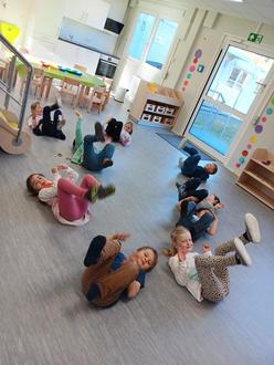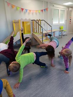 Auf dem Bild sind die Vorschulkinder bei einer kurzen Bewegungspause während dem wöchentlichen Raketentreff, wo sie auf die Schule vorbereitet werden. Die Kinder nehmen dies gerne an, damit sie dann weiter konzentriert und gestärkt ans „Lernen“ gehen können. Auch im Alltag ist dies für das pädagogische Personal eine gute Unterstützung.