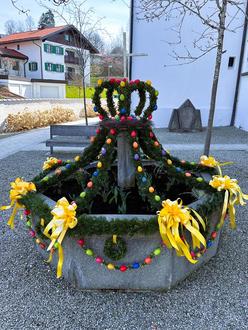 Nach einem kurzen Winter tritt unser prächtiger Osterbrunnen mit seinen leuchtenden Farben in Wettstreit mit vielen bereits blühenden Frühlingsboten. Maria Herb, Angelika Keck, Matthäus Keck und Zenzi Gast haben auch dieses Jahr wieder viel Liebe und Zeit in dieses Kunstwerk gesteckt und dem Osterbrunnen auf dem Kirchenvorplatz seinen österlichen Schmuck gefertigt.