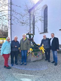 Bürgermeister Toni Barth (ganz rechts) bedankt sich im Namen der Marktgemeinde bei (v.li.) Angelika Keck, Maria Herb, Zensi Gast und Matthäus Keck, die auch in diesem Jahr wieder den Buchenberger Osterbrunnen auf dem Kirchenvorplatz geschmückt haben.