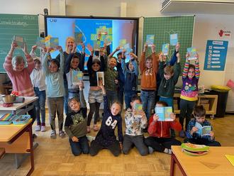 Klassenlehrerin Frau Vogler und die Kinder der dritten Klasse freuen sich über Lesestoff