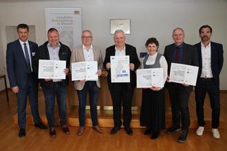 Behördenleiter Christian Kreye (links) und Martin Braun vom Amt für Ländliche Entwicklung Schwaben (rechts) übergaben mit Europaabgeordnetem Markus Ferber (Mitte) Förderbescheide an Missens Bürgermeisterin Martina Wilhelm und ihre Amtskollegen aus Fischen, Oberstaufen und Wiggensbach, Bruno Sauter, Martin Beckel und Thomas Eigstler.