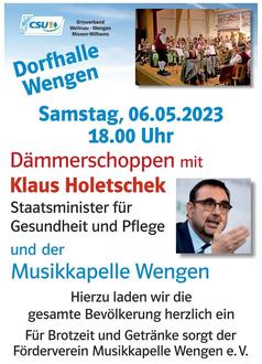 Der Förderverein der Musikkapelle Wengen e.V. lädt die Dorfbevölkerung und alle Interessierten am Samstag, dem 6.5.2023 um 18 Uhr herzlich zum Dämmerschoppen in die Dorfhalle in Wengen ein.