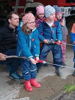 Dann wurde es praktisch - ein sehnlichst erwartetes Highlight für alle Kinder! Sie durften u.a. ein richtiges Feuer löschen. Zuerst wurde ihnen natürlich gezeigt, wie es gemacht werden sollte und dann durften sie tatsächlich selber ran – also Wasser marsch! Außerdem durften sie noch mit dem Feuerwehrschlauch auf ein „brennendes Haus“ zielen – richtig getroffen kamen sogar Gummibärchen geflogen!