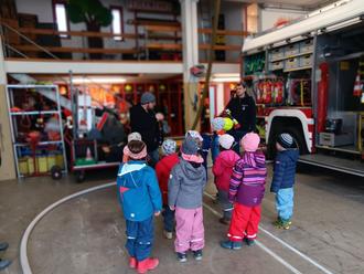 Die Vorfreude war natürlich groß und die Kinder dementsprechend aufgeregt. Den Weg ins Feuerwehrhaus wagten die Kinder und zwei Erzieherinnen trotz Schneefall zu Fuß und durften sich, dort angekommen, erst einmal ordentlich stärken. Mit leckerer Brotzeit im Bauch hörten die Kinder zunächst ein paar wichtige Infos zum Thema „Feuer“ und was im Notfall zu tun sei. Außerdem zeigten uns die Feuerwehrmänner, was sie alles in den großen Feuerwehrautos an Ausrüstung immer dabeihaben.